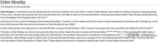 亚马逊、shop.com等电商巨头看中了这个全年线下销售的最高峰,所以会抓住线下销售往往只能持续1天就被抢空,同时库存极不稳定的弱点,所以从2005年以来持续推出网购星期一(Cyber Monday)。