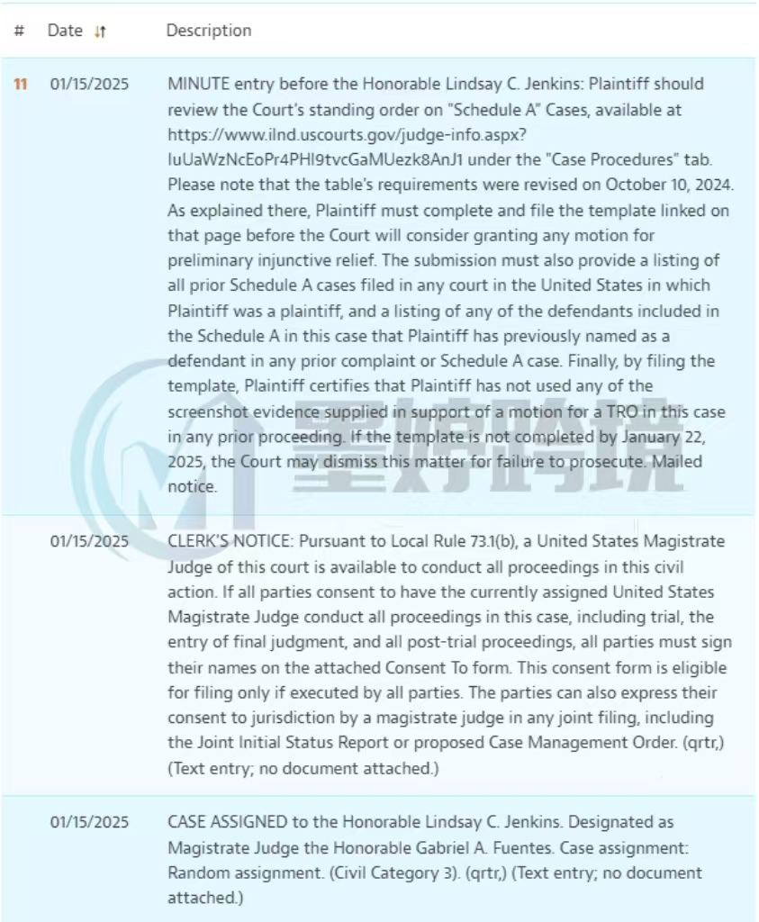 本案于2025年1月15日发起侵权诉讼,案件号:25-cv-00436、25-cv-00437。原告尚未提起TRO冻结令(Temporary Restraining Order,临时限制令)的动议,暂未获批。
