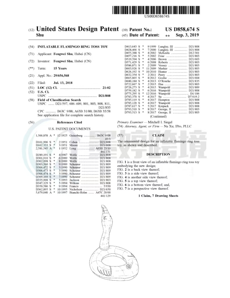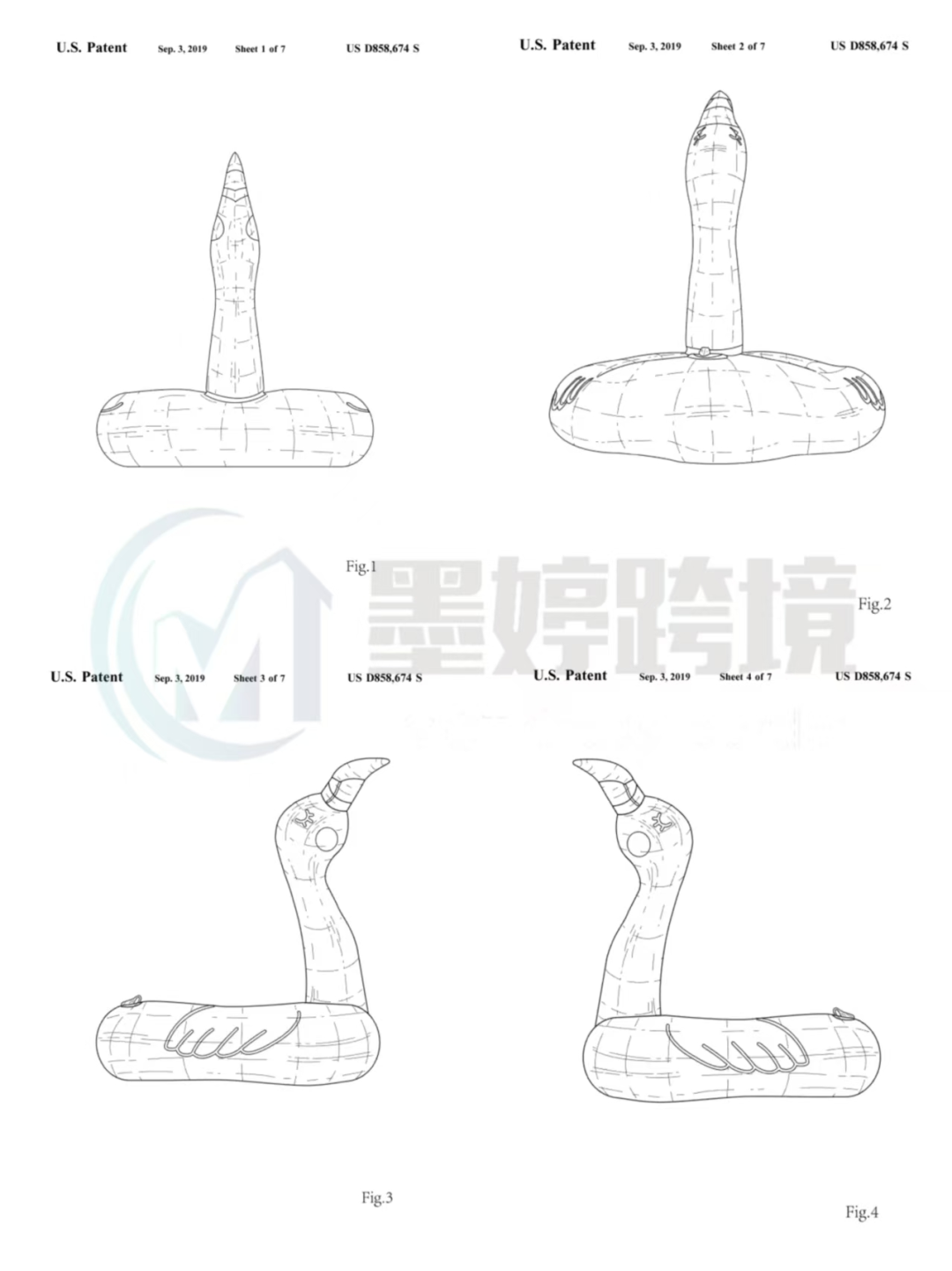 本案为专利侵权案件,由国人卖家起诉,旗下注册有一项美国外观设计专利,于2019年9月3日下证,专利号:US D858,674 S;注意,未经授权不能随意使用,侵权风险极大!