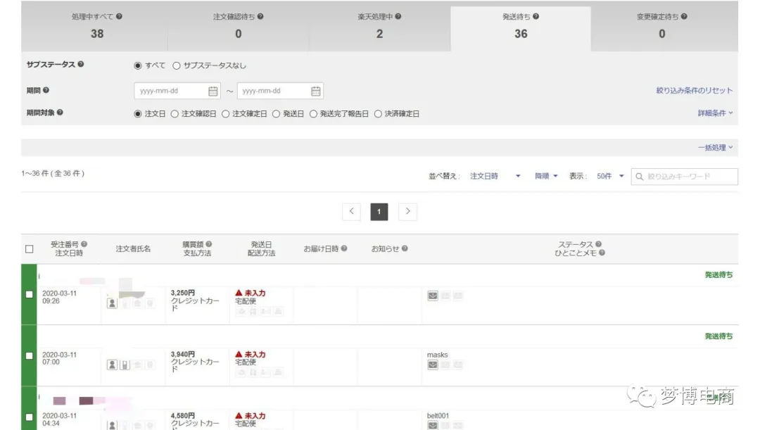 【楽天処理中】中的订单是不需要进行操作的,乐天商店的下单流程是:买家下单——卖家确认订单——买家付款——卖家确认后发货——到货后买家确认订单——乐天确认后订单结束(相比亚马逊,日本本土的乐天商店在操作上确实显得非常繁琐复杂,很有日本的风格和特点),卖家确认后等待买家付款的订单就会出现在【楽天処理中】这个界面中,买家付款结束后,【楽天処理中】中的订单会自动转移到【発送待ち】界面中。