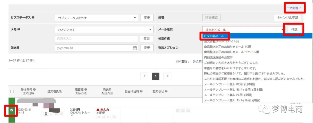 【発送待ち】中的订单是卖家需要发货的订单,乐天商店的订单需要买家发送两封邮件给卖家,第一封是在卖家发货之后需要发送邮件提醒买家已经发货,第二封是在货物送到卖家手里后发送邮件提醒卖家确认订单完成,可以说跟国内的各大电商平台走的流程相似。那么如何向买家发送邮件呢?操作步骤和订单确认相似,同样,卖家首先选择需要发送邮件的订单,然后点击【一括処理】按钮,在【メール送信】栏选择第一封【注文お礼メール】,再点击【作成】按钮就会进入邮件发送的界面中了。