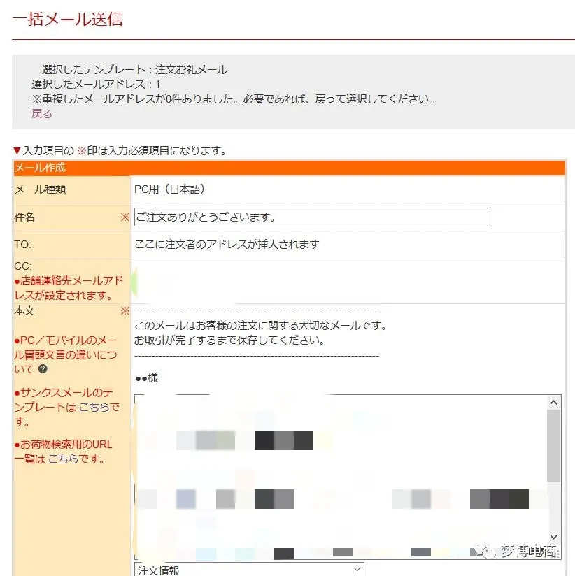 乐天邮件的内容需要卖家根据自己店铺的名称,运送方式等自行编辑,比如在亚马逊和乐天同时开店的卖家会选择用亚马逊多渠道的方式发送在乐天商店下订单的客人的货物,那么为了不引起买家和卖家之间不必要的误会,卖家就可以在邮件中说明本店的运送方式,通过邮件让买家提前知晓(在亚马逊多渠道订单时,可以在备注中说明是乐天商店的货物,双重保险)。
