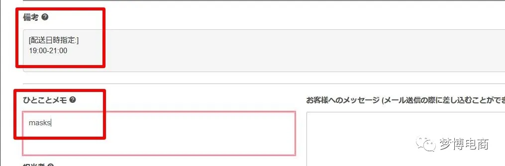 买家的送货地址和买家信息都在【送付先情報】中,这里要注意不要跟上面的【注文者情報】搞混了,有时订单会出现这两个地址不同的情况,此时以【送付先情報】中填写的地址为准。 【送付先情報】下方的【配送会社】中填写送货公司信息,该信息买家也可以查看到,方便买家查看自己包裹的物流信息。【配送日時指定】中的时间也要注意,填写时间的买家很有可能其他时间不在家中,为了避免货物运送中发生买家不在的情况(在日本有时会发生买家不在导致货物运送失败的情况),发送货物时不要漏掉指定时间信息。