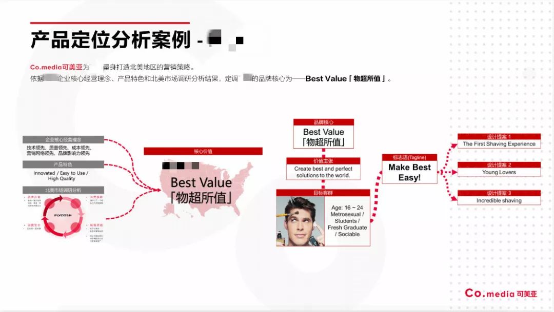 依据品牌的核心经营理念、产品特色和北美市场调研分析结果,Co.media定调某国内知名的电动剃须刀的品牌核心为——物超所值(Best Value)。