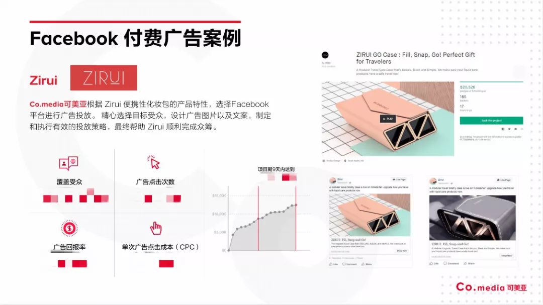Co.media根据品牌产品特性,选择Facebook平台进行广告投放。精心选择目标受众,设计广告图片以及文案,制定和执行有效的投放策略,最终帮助Zirui顺利完成众筹。