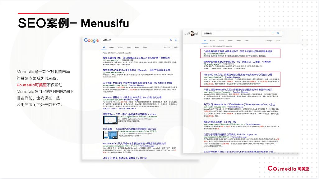 Menusifu是一款针对北美市场的餐馆点菜系统供应商,Co.media不仅帮助Menusifu在自己的相关关键词下排名靠前,也确保在挑选的公用关键词下处于前五位。