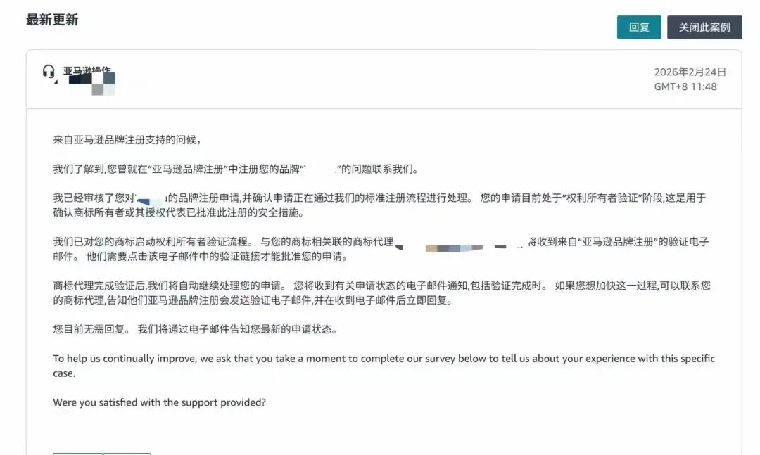 卖家需要联系商标代理律师,请他们查收邮件,再由他们转发。卖家拿到验证码后,再回到亚马逊的备案case中,回复这个验证码。亚马逊人工审核通过后,流程才会继续。