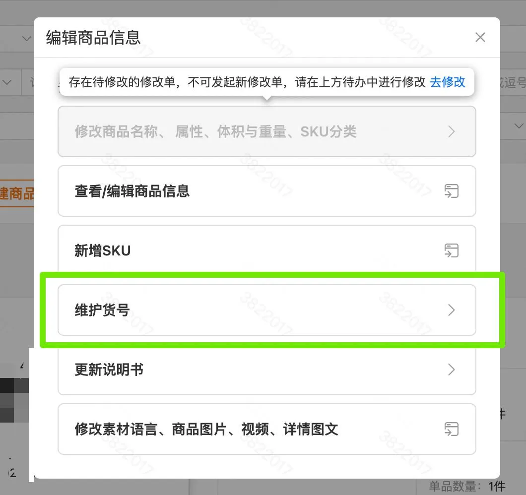 SKU 货品维护路径:商品管理-商品列表-操作-编辑-维护货号