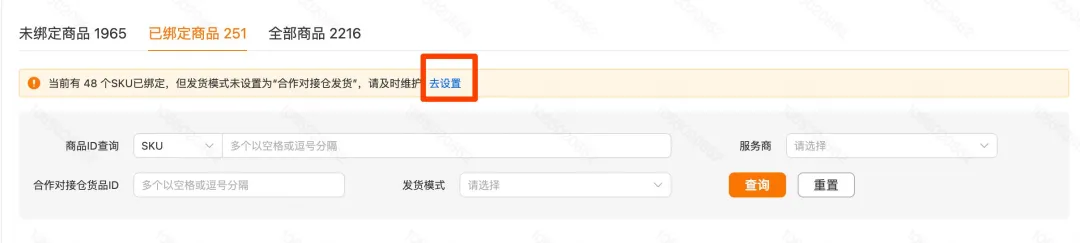若有发货模式切换失败或需要把原来设定的【卖家自发货】模式修改为【合作对接仓发货】模式,请在已绑定商品列表的发货模式进行切换。