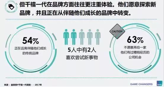 根据益普索Ipsos 2017 年针对全球千禧一代的调查显示,他们更加文化多元化,虽然 30% 的年轻人是处于无业状态的,41% 被经济负担压得喘不过气来;但这样的改变,使他们成为了更明智的一代消费者。在购买前,60% 的千禧一代总是要查找相关信息,64% 的千禧一代会追寻最好的服务和价格。另一方面,千禧一代在品牌方面更注重体验。他们愿意探索新品牌,并且正在从伴随他们成长的品牌中转变。这样的转变体现为:54% 的千禧一代正在远离伴随他们成长的传统品牌——这也为中国品牌提供了绝佳的市场进入时期。