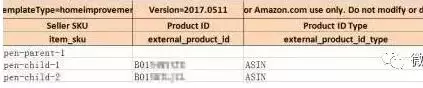 注意:Product ID可以填写ASIN、GCID、UPC等,如果要使用ASIN,那么就在Product ID Type手动输入ASIN。在Update Delete一栏中父商品首次上传,填写Update,子商品填写 Partial Update。