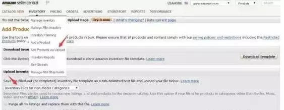 1、下载产品对应模板 通过Inventory > Add Products via Upload > Download Template,下载对应的产品模板。