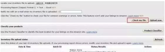 在页面有一个Check my file的选项,卖家可以先点击生产报告,让亚马逊检测表格是否有填写错误,如果有的错的可以根据生成的报告修改重新上传,如果没有错误的可以选择上传哦,一般5-10分钟之内就可以合并成功了。