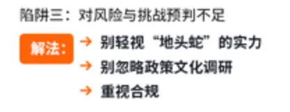 陷阱三:对风险与挑战预判不足海外市场的政策环境、市场规则、竞争格局与国内市场存在巨大差异,很多企业忽视了本地市场的潜在风险,最终导致战略推进受阻。