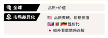 市场差异化表达:不同区域市场的消费偏好存在明确差异,美国市场更看重产品的品质质感与价格价值的平衡;欧洲、英国、德国等市场,将性价比作为核心决策因素;同时,部分区域市场额外看重产品与品牌带来的情感连接。品牌需要在守住品质核心的基础上,针对不同市场做差异化的策略适配,而非用一套方案覆盖所有市场。
