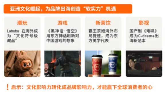 亚洲文化崛起,为品牌出海创造软实力机遇全球消费市场对亚洲文化的接受度与认可度持续提升,文化影响力可直接转化为品牌影响力,成为品牌出海的核心差异化优势。多个赛道已验证这一逻辑:潮玩赛道,Labubu在海外成为符号级藏品;游戏赛道,黑神话悟空用东方神话刷新全球市场对中国游戏的认知;新茶饮赛道,霸王茶姬以东方茶饮美学成为海外市场的东方美学代表;影视赛道,国产剧集通过C-drama模式成为文化出海的新范本。这一趋势的核心启示是,将文化内涵融入品牌内核,才能真正赢得全球消费者的心智认同。