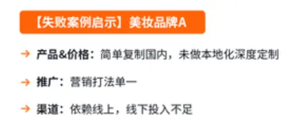 失败案例参考:美妆品牌A的核心问题,在于产品与价格体系简单复制国内模式,未做本地化深度定制;推广端仅依赖单一的营销打法,没有构建多维度的品牌传播体系;渠道端过度依赖线上流量,线下渠道与用户运营的投入严重不足,最终无法在本地市场建立长期竞争力。