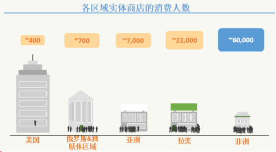 第四,非洲的消费群体希望跃过线下实体商店。William指出,电商发展其实是非洲经济发展的必然趋势,他以成熟发达地区零售业和非洲线下零售业为例作对比分析,比如在美国,约有400个消费者分享一个大商场购物,但在非洲约有60000人才仅享受到一个小商铺。为此,制造业不发达以及线下零售业的紧张将使得非洲电商得以迅速发展。
