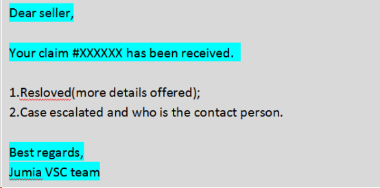 另外,所有Raise a Claim均由Jumia VSC team专人跟进,而非系统自动回复,邮件回复格式如下 :