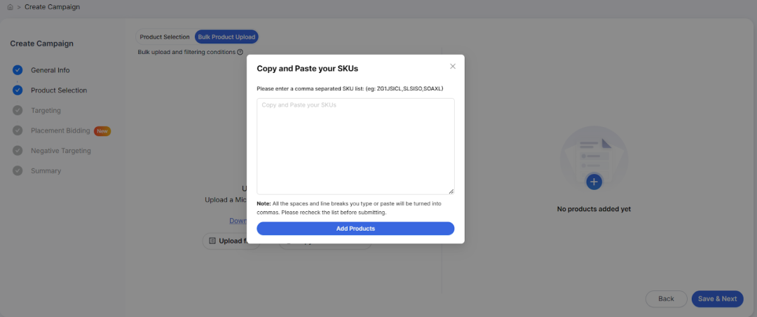 粘贴完成后,点击“Add Products”,然后点击“Save and Next”,即可完成SKU的批量添加。