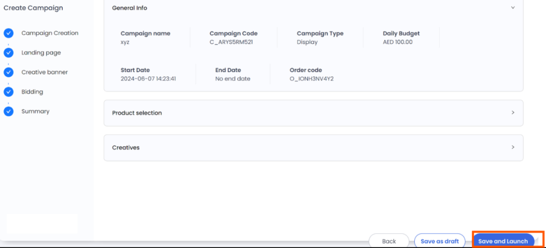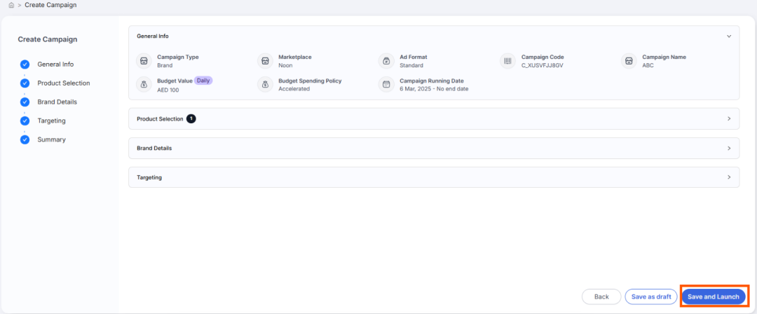 完成设置后,点击“Save Launch”即可实时激活广告投放。如果还需要更多时间进行调整,可点击“Save as Draft”将广告投放保存为草稿,方便稍后继续设置。