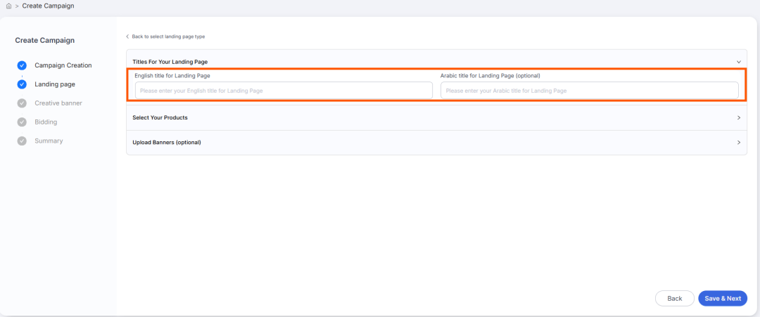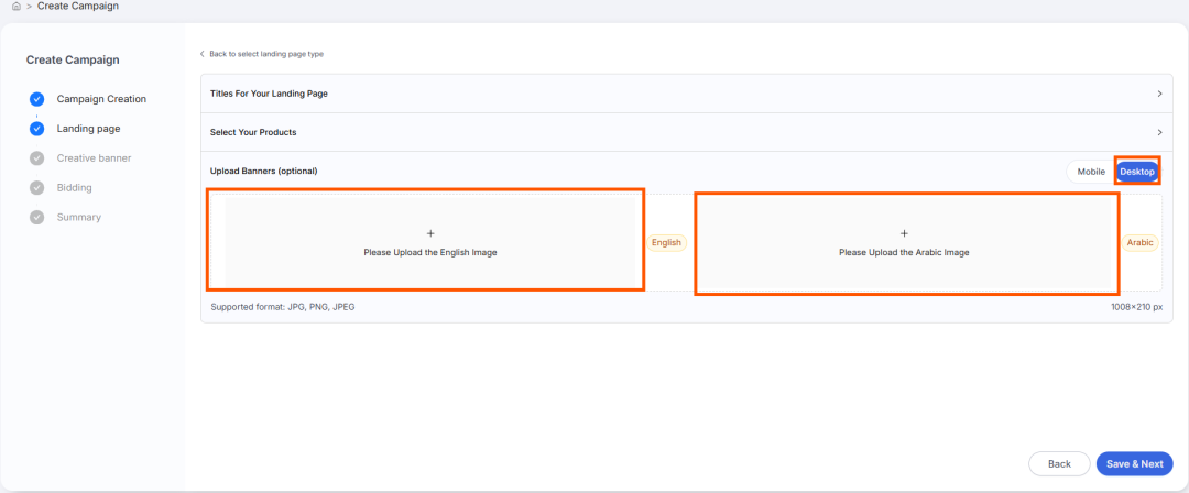 输入引导页标题,英文为必填项,阿拉伯文为选填项。