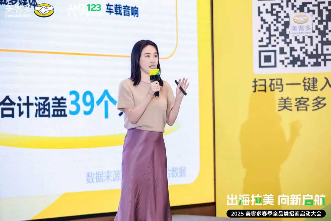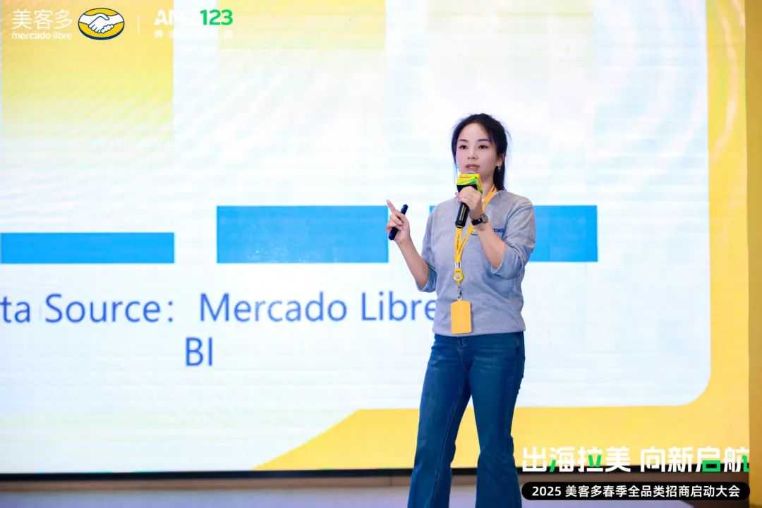 会议开始,美客多中国渠道招商及服务生态管理商务经理Chelsea Xu带卖家深入分析了拉美市场的增长机遇,详细解析了美客多平台的生态系统,并探讨了美客多热门流量站点的潜力及消费风向。她还对2025年美客多的全新招商政策进行了官方解读,为参会卖家提供了宝贵的市场洞察和政策指导。