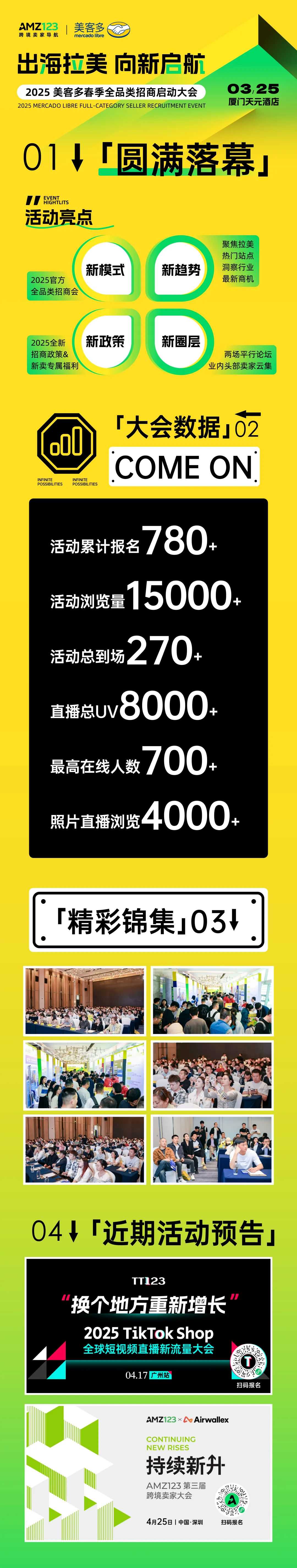 为了帮助卖家把握拉美市场的新机遇,AMZ123携手美客多于3月25日在厦门天元酒店共同举办了2025美客多春季全品类招商启动大会,并圆满落幕。