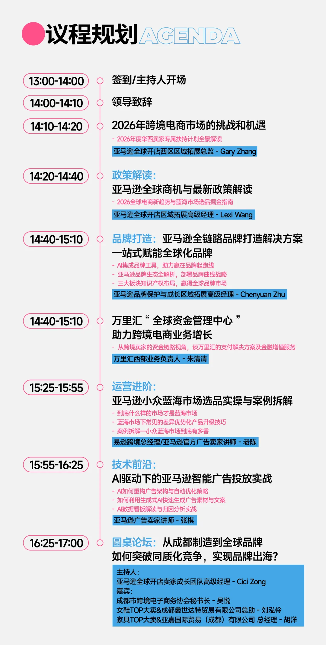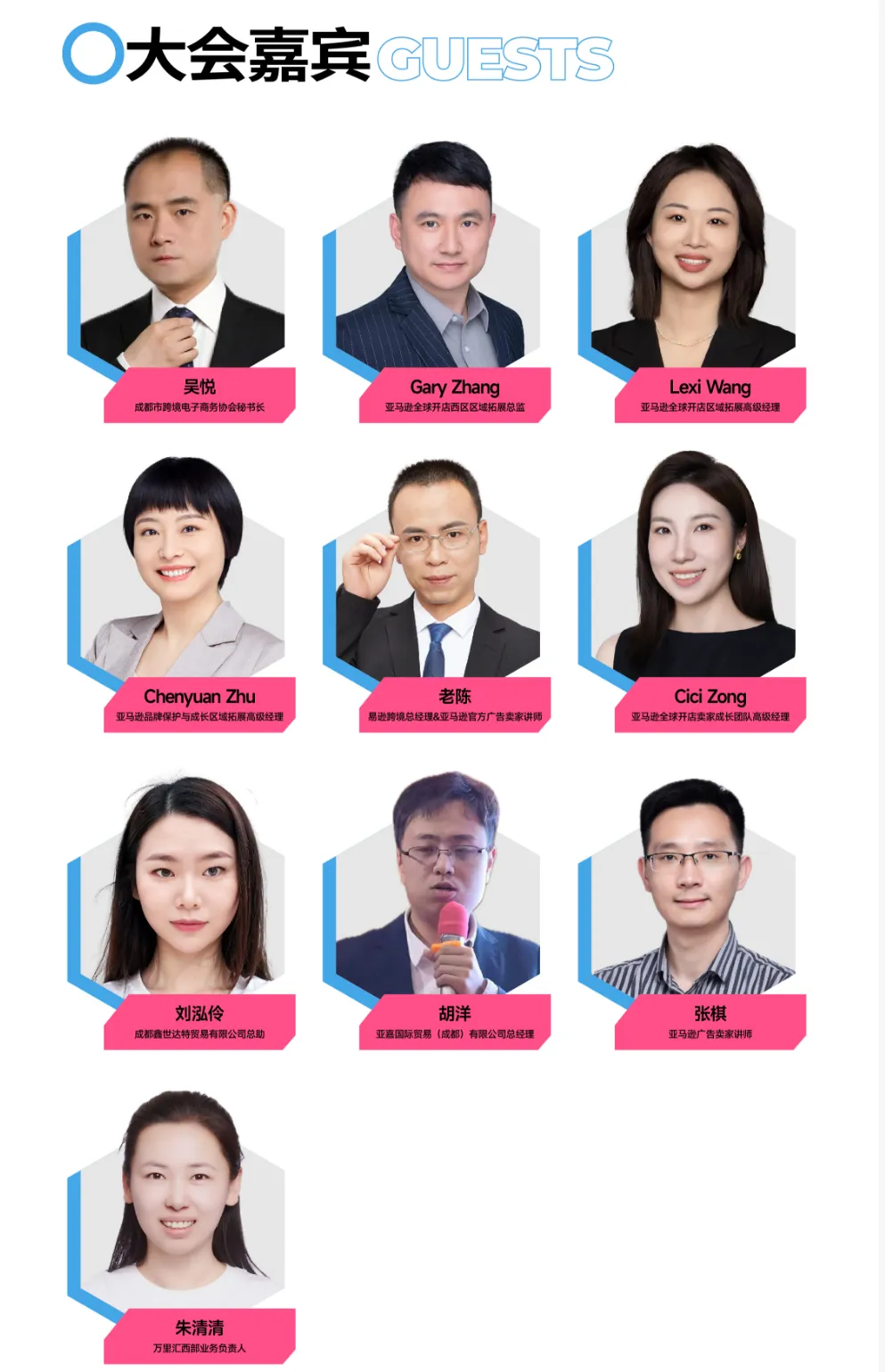 本次大会将邀请多位行业大咖和TOP级卖家分享他们的实战经验和运营技巧,包括万里汇西部业务负责人朱清清、成都市跨境电子商务协会秘书长吴悦、亚马逊全球开店西区区域总监Gary Zhang、亚马逊品牌保护与成长区域拓展高级经理Chenyuan Zhu等。