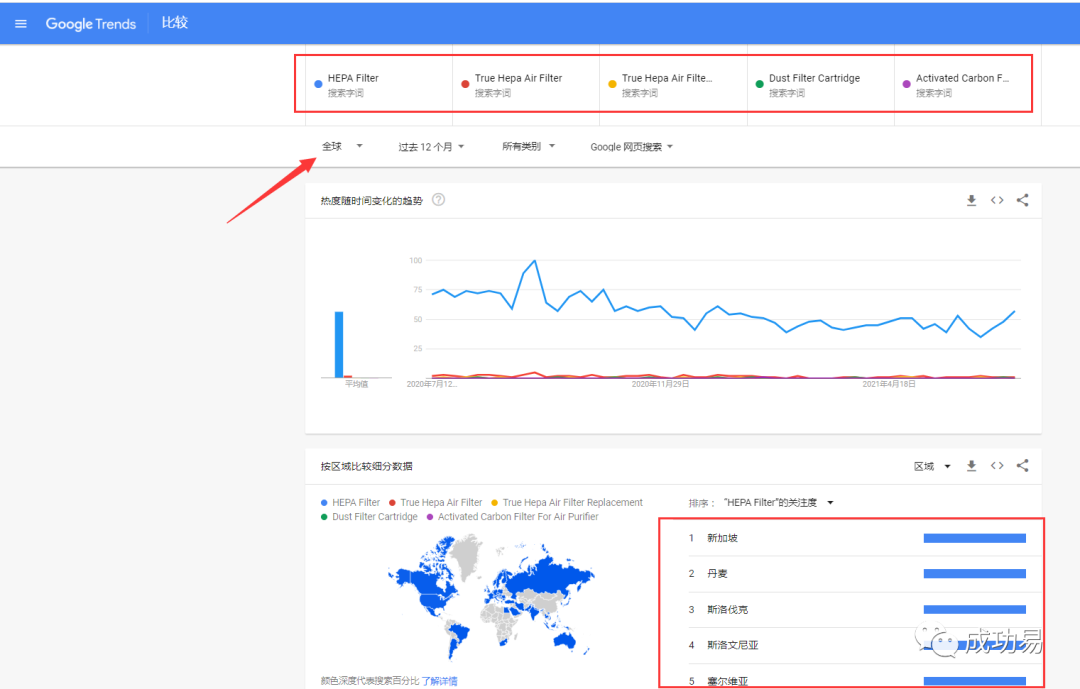 如果投放国家本身这类产品关键字的搜索量就比较少的话,那预算花不出去就很正常,我们投放之前可以用谷歌趋势来查一下,该产品关键字在这个国家的搜索趋势如何。下图举例的是不同的产品关键字在全球的搜索量趋势,下面会展示具体的国家。