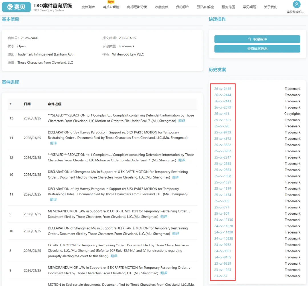 从赛贝TRO案件查询系统获悉,原告Those Characters from Cleveland, LLC通过WHITEWOOD LAW PLLC律所发起维权诉讼,直接3案连发,原告核心品牌CARE BEARS(爱心熊)常年高频维权,每年均会发起多起TRO案件,且原告布局了上千项版权及多个商标,维权力度极强,相关跨境卖家、电商从业者需高度警惕,避免卷入侵权纠纷。