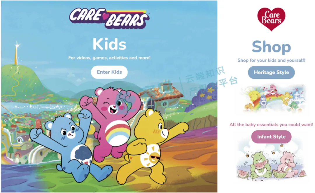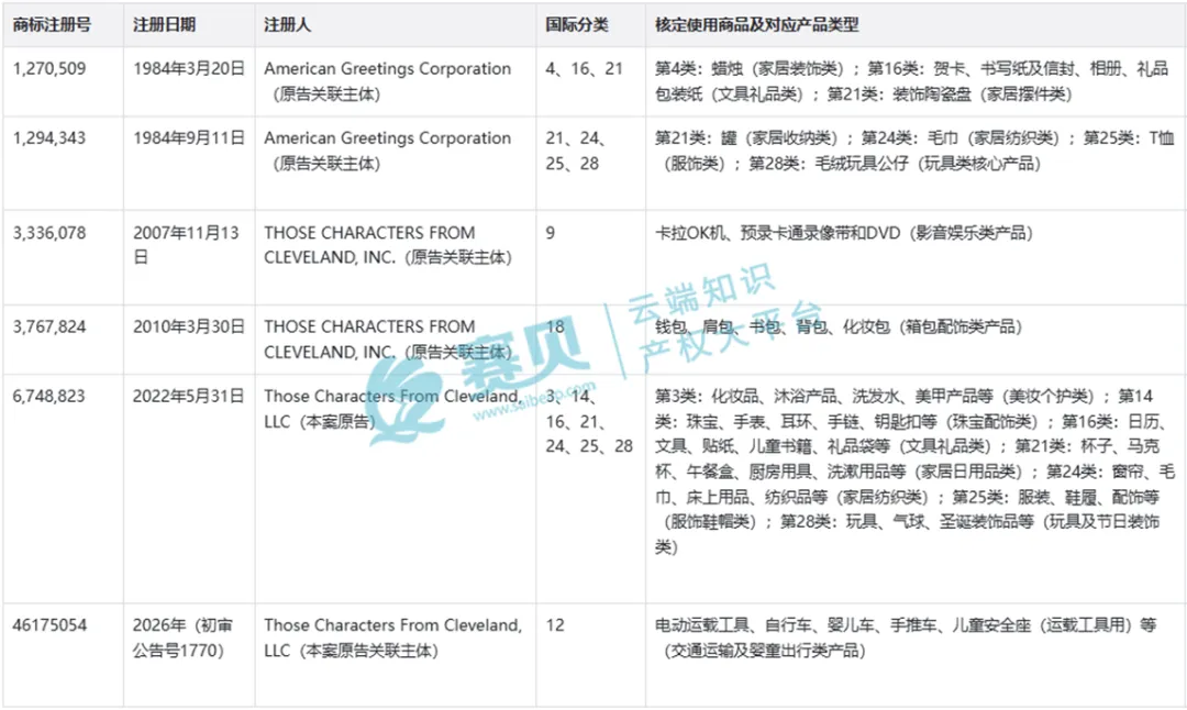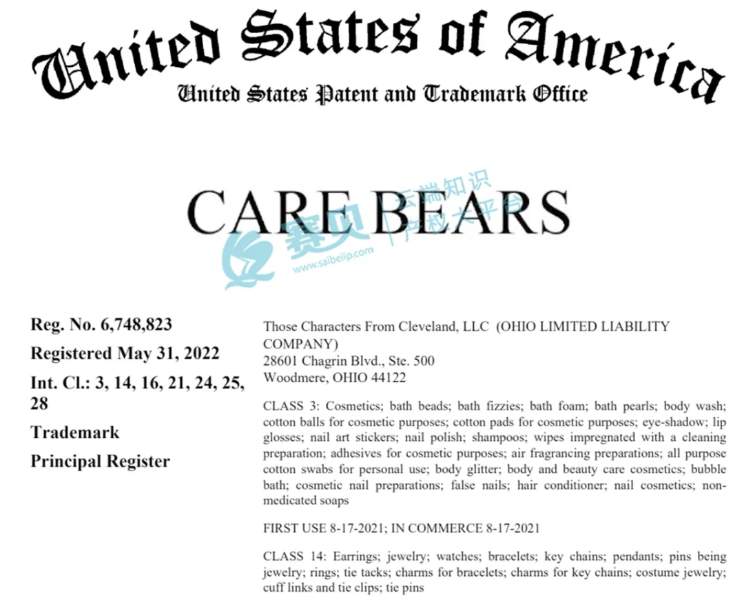 Those Characters from Cleveland, LLC 是一家注册于美国俄亥俄州的专业品牌创意娱乐公司,核心业务聚焦于知名卡通IP的孵化、运营及知识产权保护,旗下除了CARE BEARS(爱心熊),还拥有Madballs、Holly Hobbie等多个知名品牌,在儿童文化领域具有广泛影响力。其中,CARE BEARS(爱心熊)作为其最具代表性的IP,自1982年启用商标、1986年系列动画片上映以来,凭借色彩鲜艳的卡通熊形象、传递温暖关爱的核心主题,迅速风靡全球,成为跨世代观众心中的经典卡通IP。