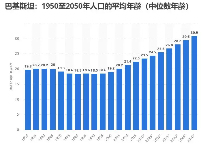 上表统计数据显示了1950年至2050年巴基斯坦人口的年龄中位数。年龄中位数是将人口分为两个数量相等的群体的年龄。而由上表可见,2015年的年龄中位数为22.5岁,而该机构估计,到2020年,年龄的中位数为23.5岁。由此可见,巴基斯坦的人口趋于年轻化。