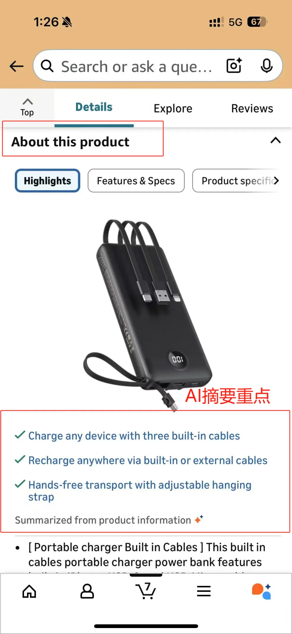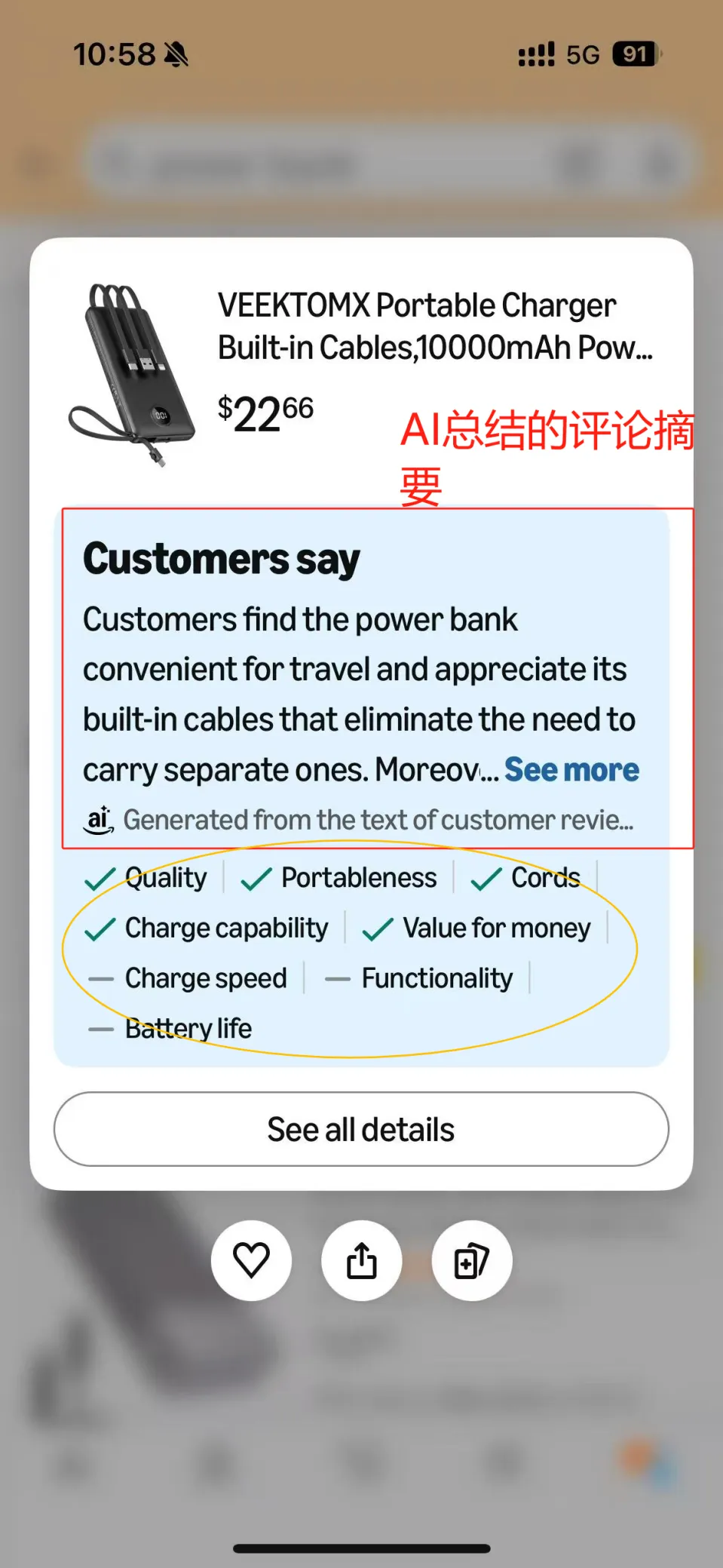 就拿一款充电宝来说,在搜索页长按它的商品卡片,弹窗立马出来:“用户说这个充电宝非常适合旅游使用,并赞赏其内置充电线设计,这使他们无需再携带单独的充电线”,后面还会附上充电速度、性价比这些维度的评价,甚至连大家偶尔吐槽的小问题也会提。以前得点进详情页,在几十上百条评论里找有用的信息,现在几秒钟就能完成初步筛选。