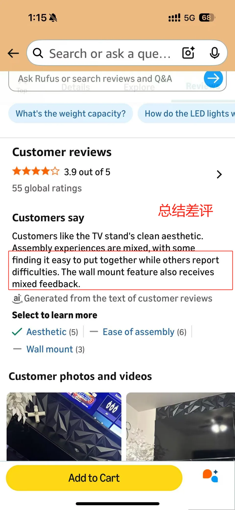 在传统模式下,部分负面评价可能被海量好评淹没,消费者需翻页才能看到。而新功能下,AI 会主动抓取高频负面反馈并前置展示,一旦某个负面问题出现 3 次以上,就可能被纳入摘要,直接影响消费者的点击意愿。例如,某款电视柜若有多位用户反映 “安装困难”,这一痛点会直接出现在搜索弹窗中,即便商品主图精美、价格优惠,也可能被消费者直接 pass。