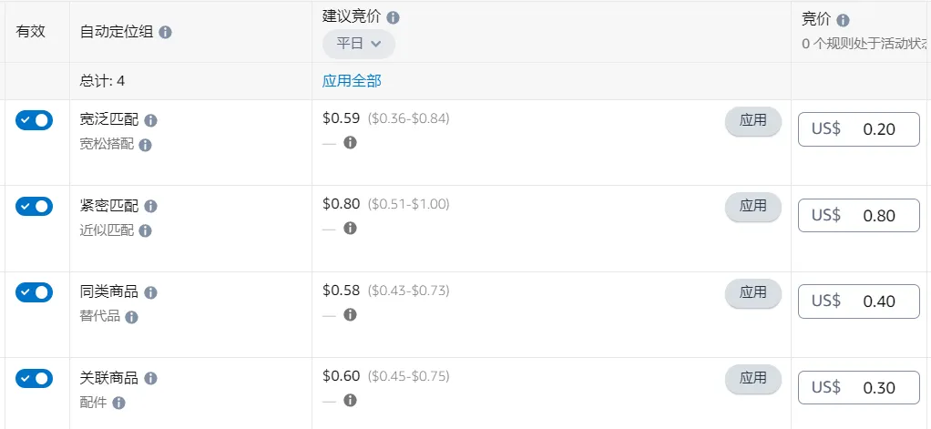 不要使用亚马逊默认的“一组竞价”。广告组设置里,把4种匹配模式的出价拆开: