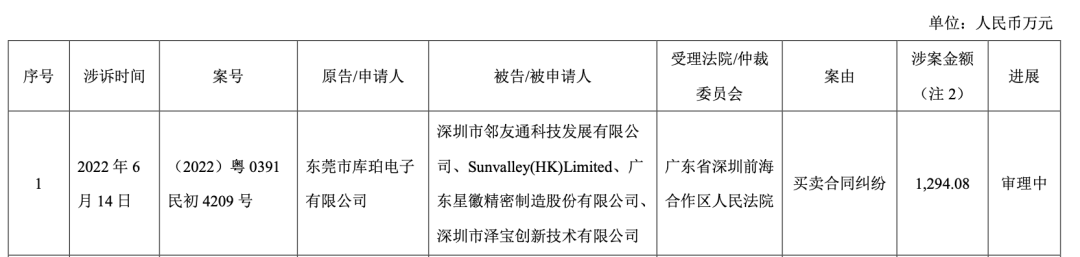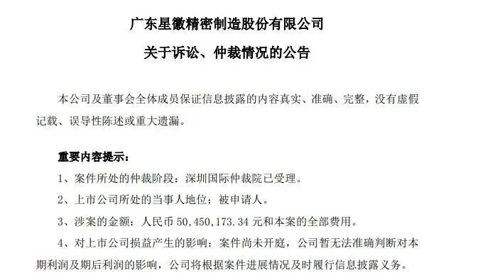 公告显示,佛山市顺德区雅富电子有限公司与星徽股份旗下两家子公司,深圳市邻友通科技发展有限公司和深圳市丹芽科技有限公司签订了《采购框架合同》,因承揽合同纠纷,雅富电子向深圳国际仲裁院申请了仲裁。