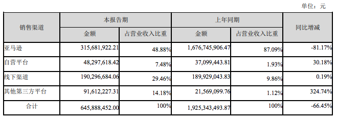 从销售渠道看,上半年星徽股份在亚马逊的销售金额为3.1亿元,同比下降81.17%,而自营平台、线下渠道以及其他第三方平台则有明显的增长,其中,其他第三方平台增长幅度最大,达到324.74%,金额为9161万元。