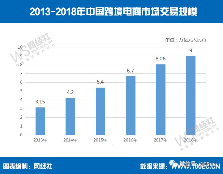6月5日,网经社旗下国内知名电商智库电子商务研究中心(微信ID:i100ec)发布了《2018年度中国跨境电商市场数据监测报告》报告显示,2018年中国跨境电商交易规模达9万亿元,同比增长11.6%。
