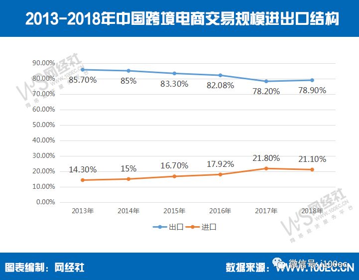 据网经社-电子商务研究中心监测数据显示,2018年中国跨境电商的进出口结构上出口占比达到78.9%,进口比例21.1%。