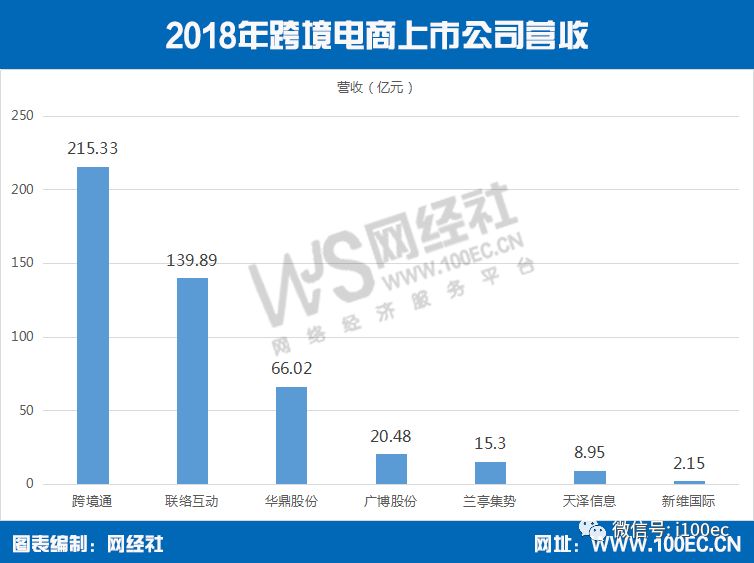 据网经社-电子商务研究中心监测数据显示,2018年跨境电商上市公司总营收达468.12亿元,营收排名分别为:跨境通215.33亿元、联络互动139.89亿元、华鼎股份66.02亿元、广博股份20.48亿元、兰亭集势15.3亿元、天泽信息8.95亿元、新维国际2.15亿元。