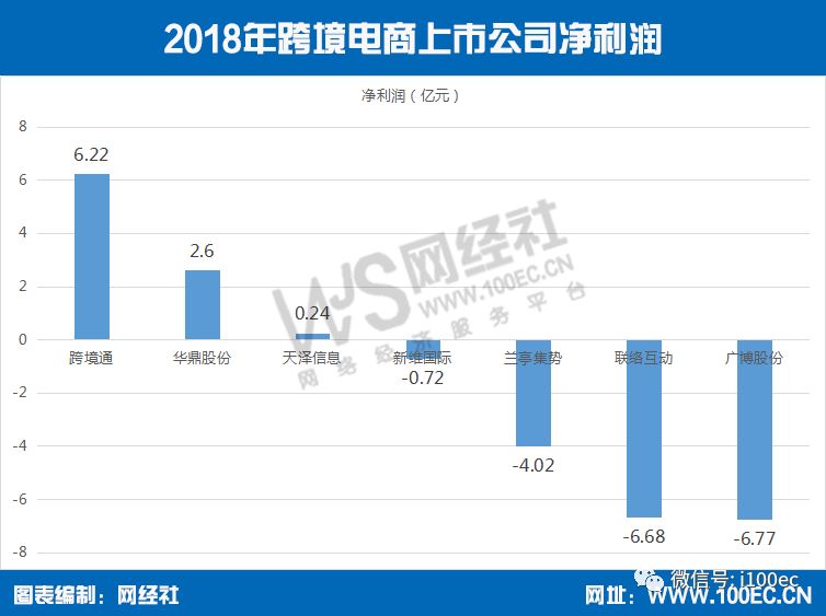 据网经社-电子商务研究中心监测数据显示,2018年跨境电商上市公司净利润排名上,跨境通6.22亿元、华鼎股份2.6亿元、天泽信息0.24亿元、新维国际-0.72亿元、兰亭集势-4.02亿元、联络互动-6.68亿元、广博股份-6.77亿元。