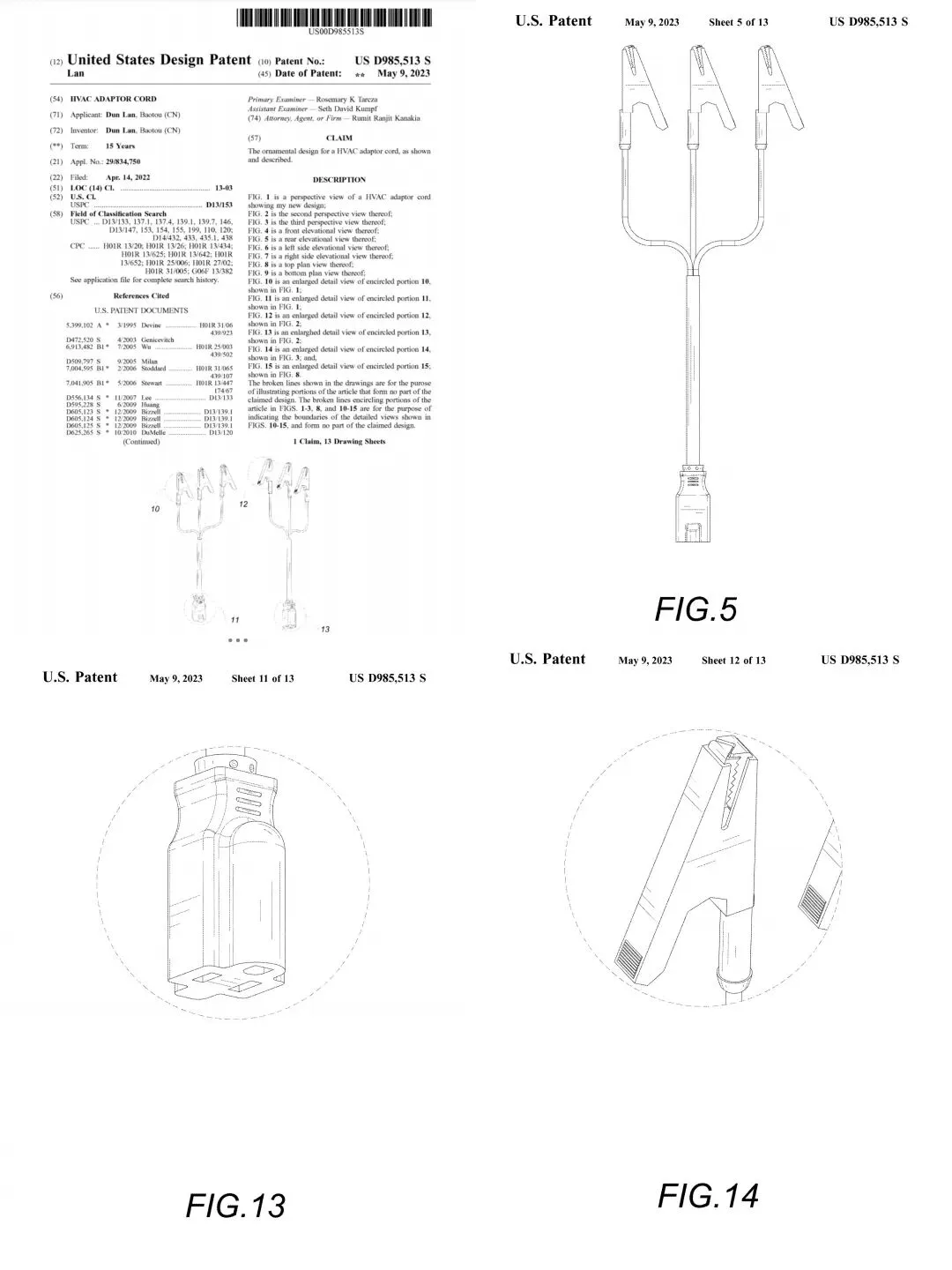 本案涉及外观专利维权,原告名下仅有一条外观专利:USD985513,该专利于2022年4月14日申请,2023年5月9日下证。
