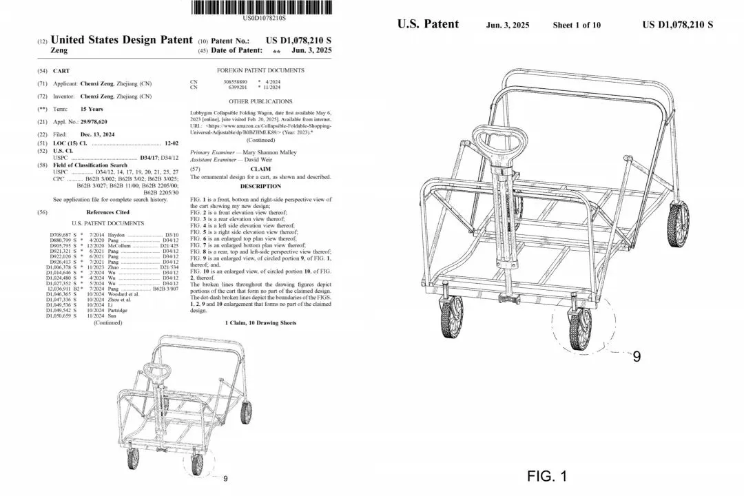 本案涉及外观专利维权,原告名下仅有两条外观专利:USD1067671S,该专利于2025年1月6日申请,2025年3月25日下证;USD1078210S,该专利于2024年12月13日申请,2025年6月3日下证。