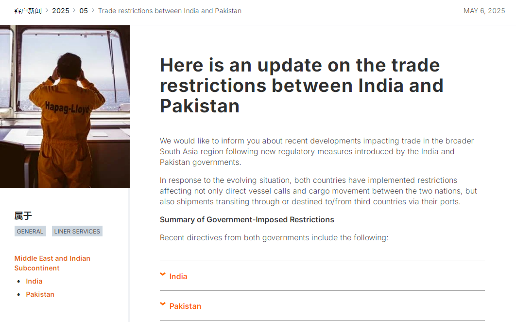 鉴于此,多家船公司发布相关预警“印巴两国之间贸易限制最新情况”。