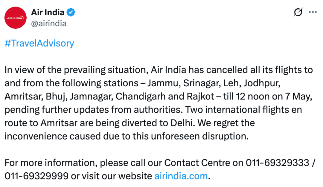印度多家航司(印航、靛蓝航空、香料航空等)分别发布出行提示称,鉴于当前局势,印度北部部分地区的机场将关闭,直至另行通知。