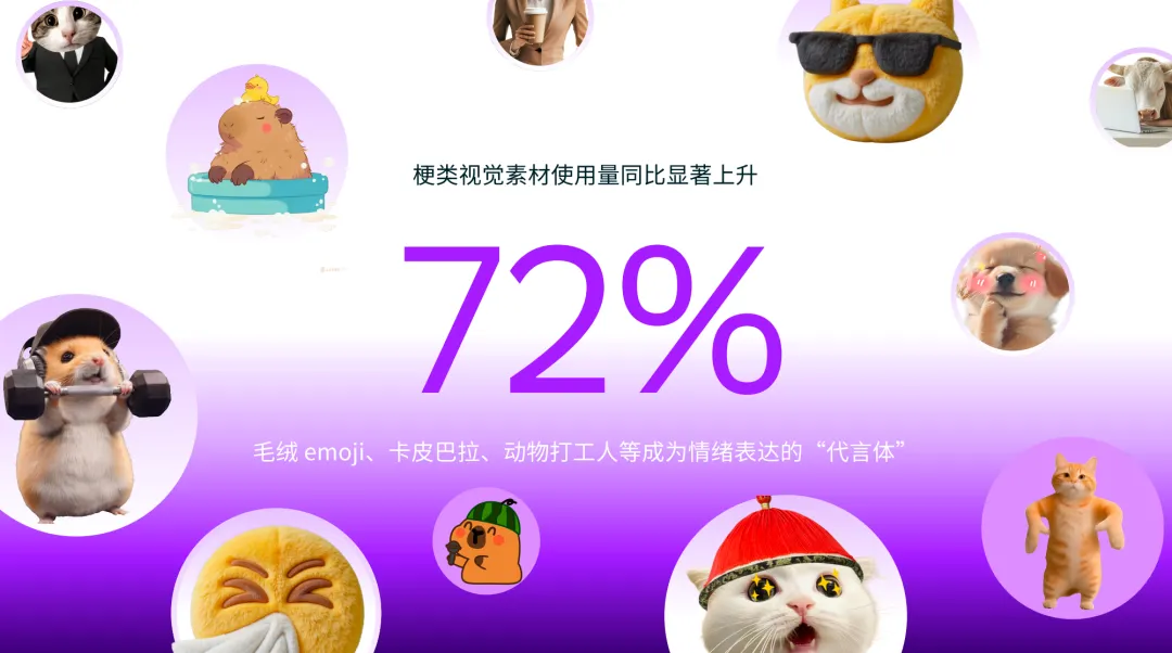 基于Canva可画的中国创作数据,其发现,以“玩梗”为核心的模板与素材使用量同比增长 72%,动物拟人、古人说梗、毛绒材质等风格正成为社交内容与演示场景中的常见视觉语言。创作者们,正习惯“用情绪表达内容”。这些素材往往并不追求信息密度,却能在极短时间内完成情绪传递:疲惫、自嘲、共情、调侃,甚至是一种“我懂你”的默契感。