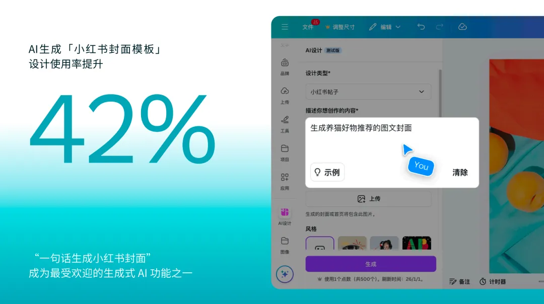 而这种变化和平台生态、以及 AI 的加入,是一起发生的。Mia指出,小红书相关的内容创作量在Canva可画上整体增长了超过70%的同时,我们也看到“一句话生成小红书封面”这类AI功能上线后,在近两个月里,使相关设计使用率提升了 42%。