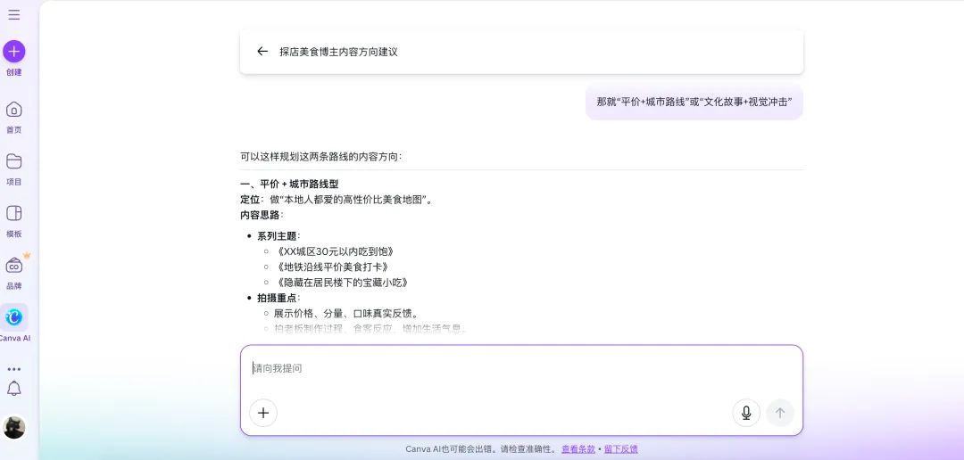 于是,与许多强调“生成能力”的 AI 产品不同,Canva AI的切入点非常明确:先解决“怎么开始表达”的问题。