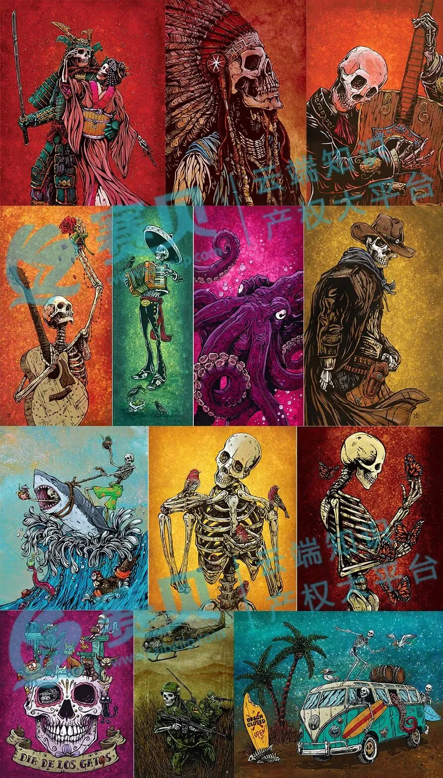 这次维权的 13 项版权作品,类别也很明确,有亡灵节主题类的,比如带万寿菊、骷髅面具元素的插画;有骷髅角色加场景类的,像西部风、海洋风的骷髅形象;还有动物与流行文化类的,涵盖了不少热门元素。这些作品的版权保护范围不仅包括完整画作,“截取局部角色、调整色彩、改变尺寸” 都算衍生侵权。